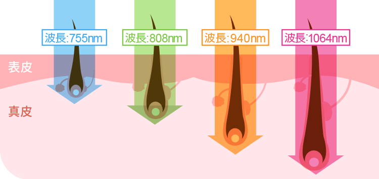1つのレーザーだと全ての毛質・肌色に対応することが難しいですが、当院の脱毛機では4つの波長のレーザーを一台で照射することできます。そのため全身の毛を一気に脱毛でき、効率よく効果が出やすいです。