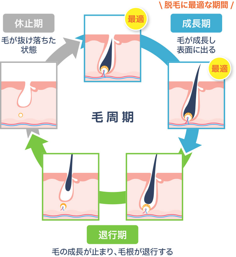 毛周期は脱毛の効果に大きく関係し、「成長期」に合わせて数回照射をすることで減耗を実感できます。