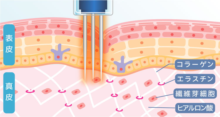 極細の針で肌に小さな穴を開けることで線維芽細胞が刺激され、傷ついた組織を修復する「創傷治癒能力」が働き、コラーゲンやエラスチンの増生を促します。皮膚のハリ感や、毛穴の引き締め・開きへの効果、ニキビ跡の改善が期待できます。