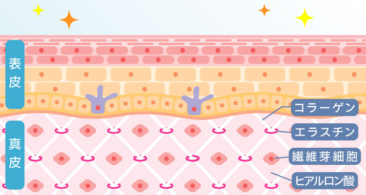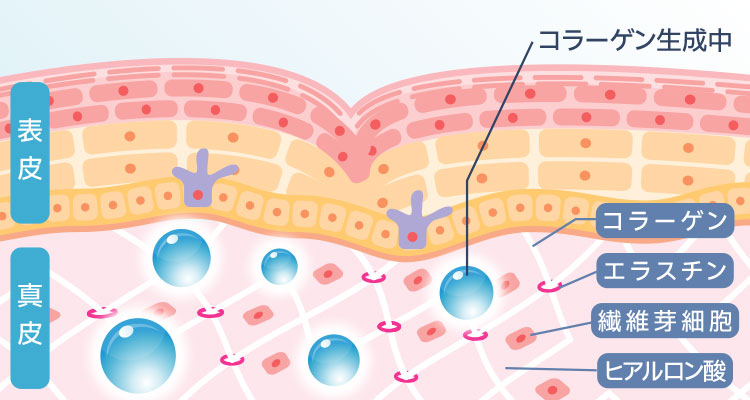 傷を修復しようと創傷治癒が働き、美肌の元であるコラーゲン、エラスチン、ヒアルロン酸が分泌される。