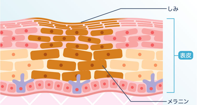 - シミの元となるメラニン色素が肌のターンオーバーで肌の外に徐々に押し出されることにより、シミは次第に薄くなります。色素が完全に排出される一歩手前の肌の表面近くにある状態では、一時的にシミが濃くなったように感じることがあります。