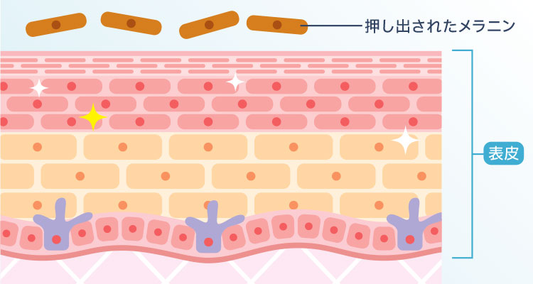 皮膚の代謝でシミの色素が剥がれ落ち、肌の活性化で生成されたコラーゲンがハリ・ツヤを出して美肌に導く。